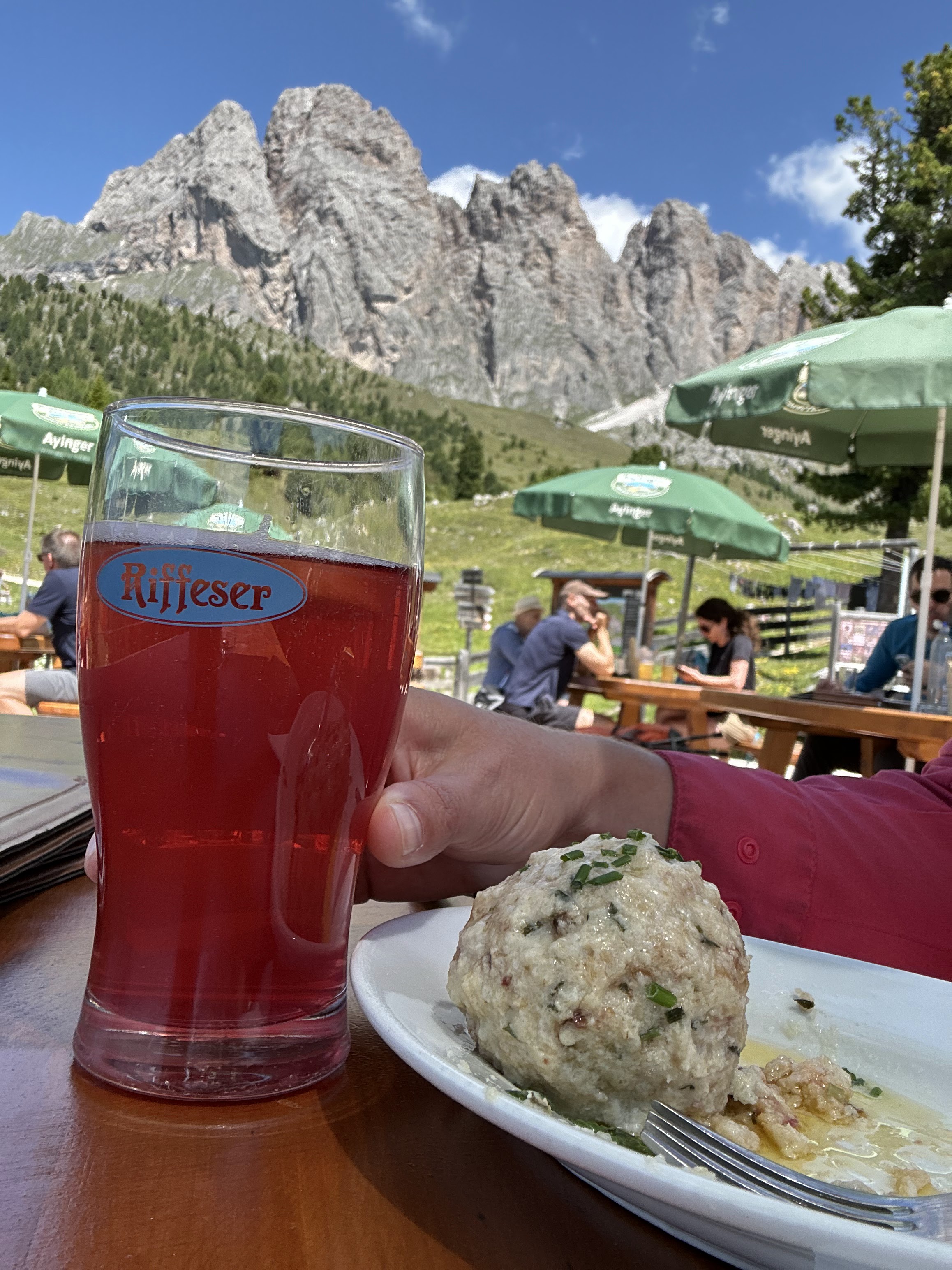 For the Seceda loop hike I followed the Moon & Honey route and combined it with an AllTrails route to add a bit more to Moon & Honey’s recommended loop and to get a respite from the more trafficked route. I still ended up at the same lunch spot: the delicious Rifugio Firenze / Regensburger Hütte! (where I discovered the wonderful hiking drink called radler! It’s half light beer, half lemonade and so refreshing.)